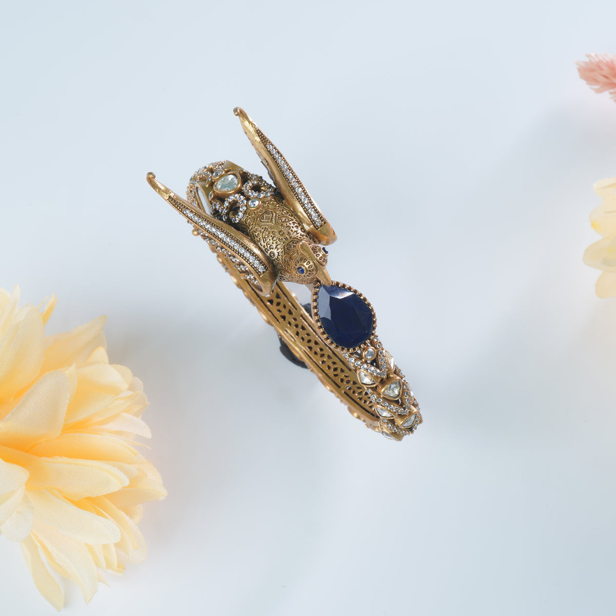 A stunning silver Moissanite bangles design studded with stones and Moissanite's . The blue stones adds a touch of regalness to this silver bangles . Match them with our silver Moissanite necklace for a perfect look