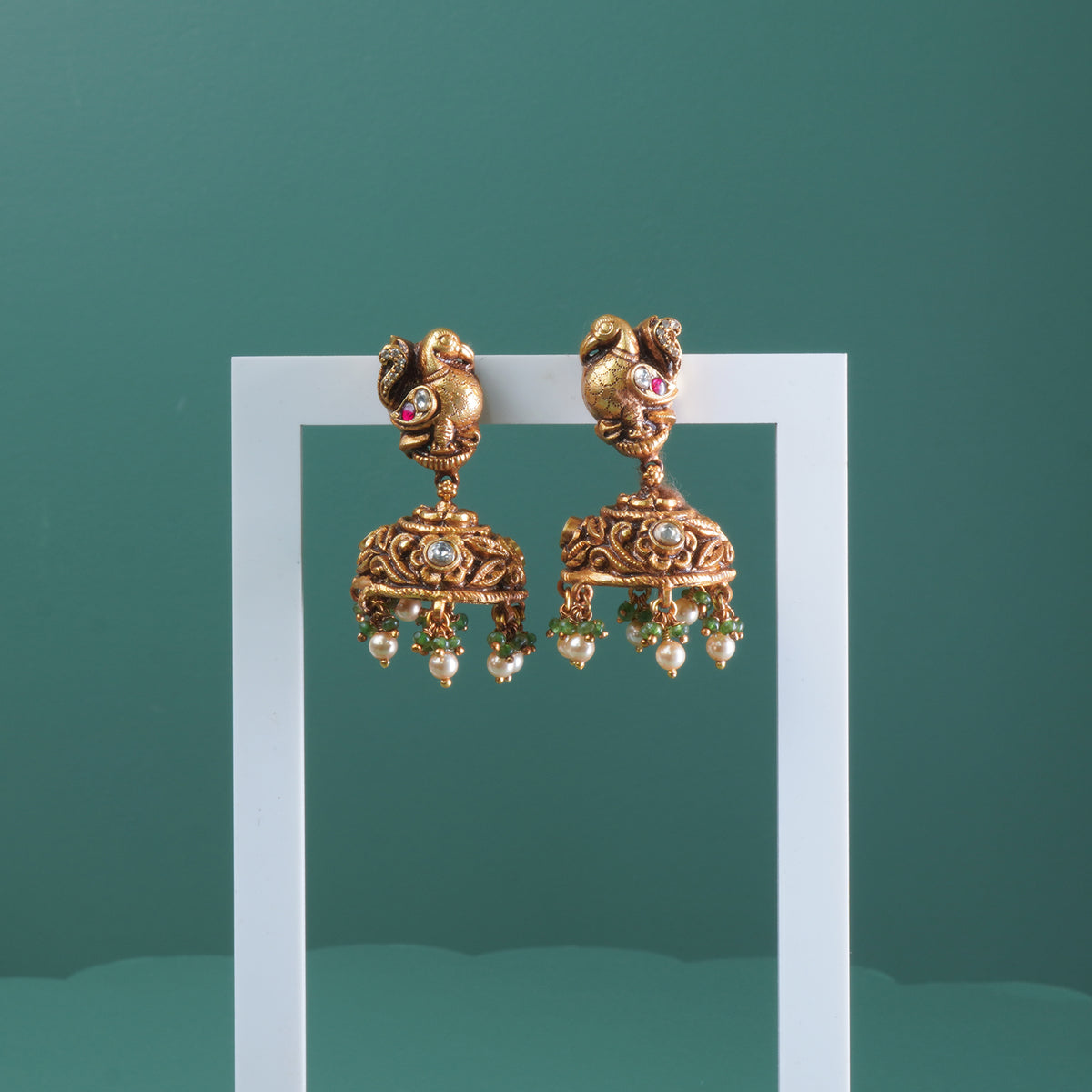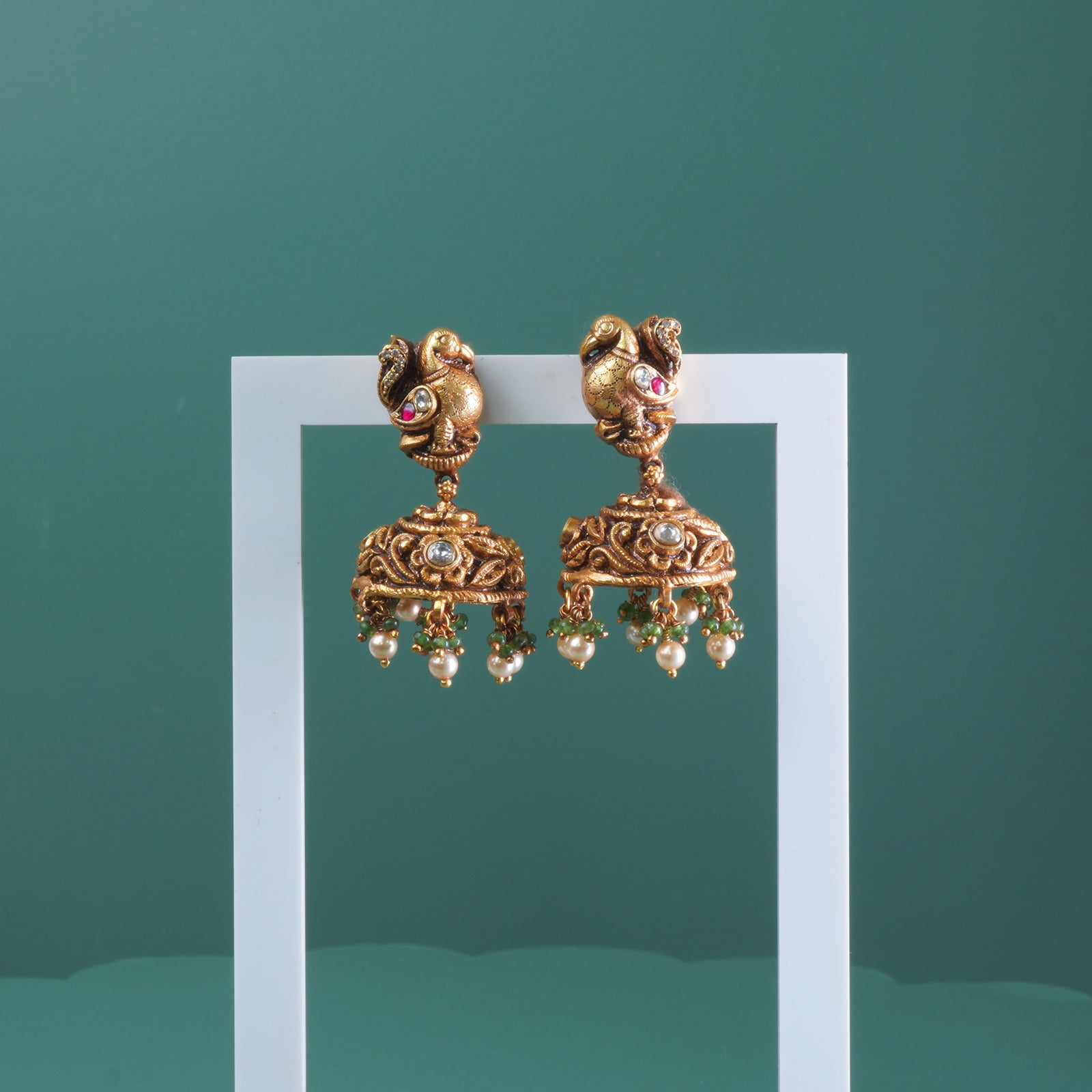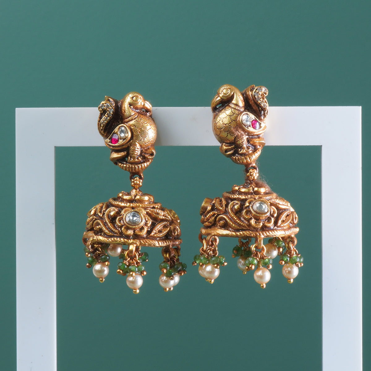 Silver Antique Gold Plated Intricate Nakashi Kemp Peacock Jhumki With Red Strawberry beads