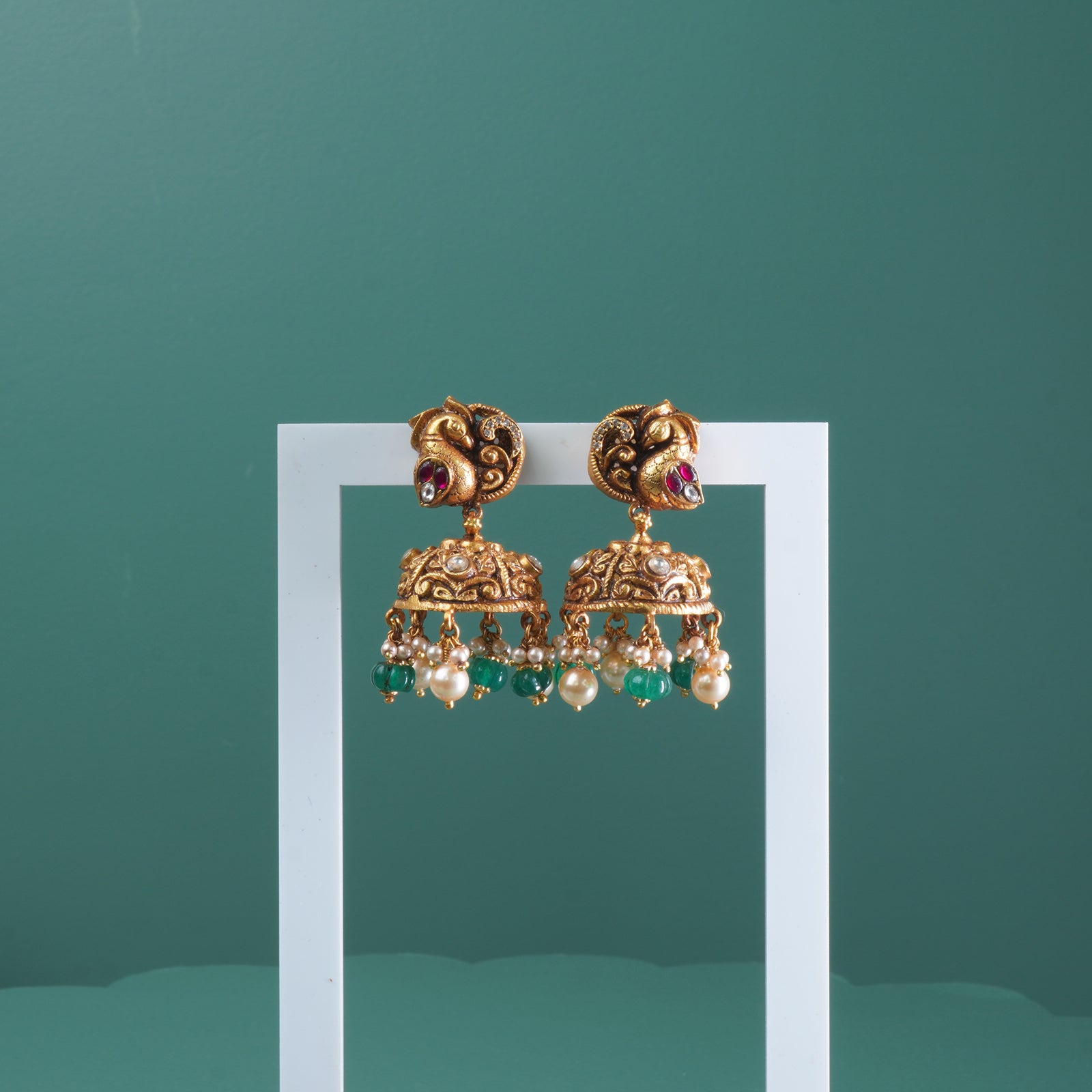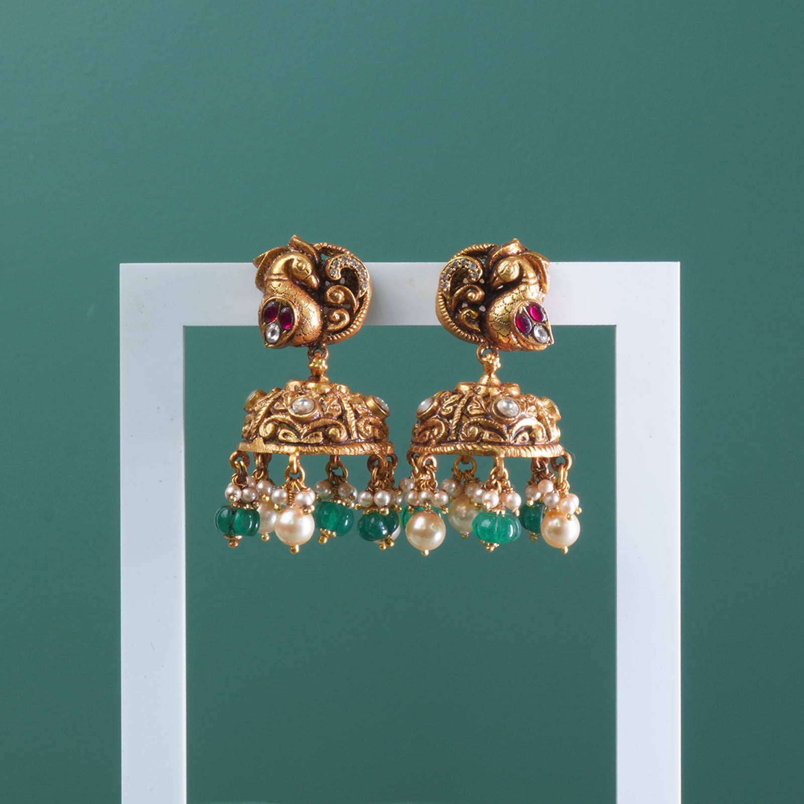 Silver Antique Gold Plated Nakashi Peacock Jhumki With Green Strawberry Beads