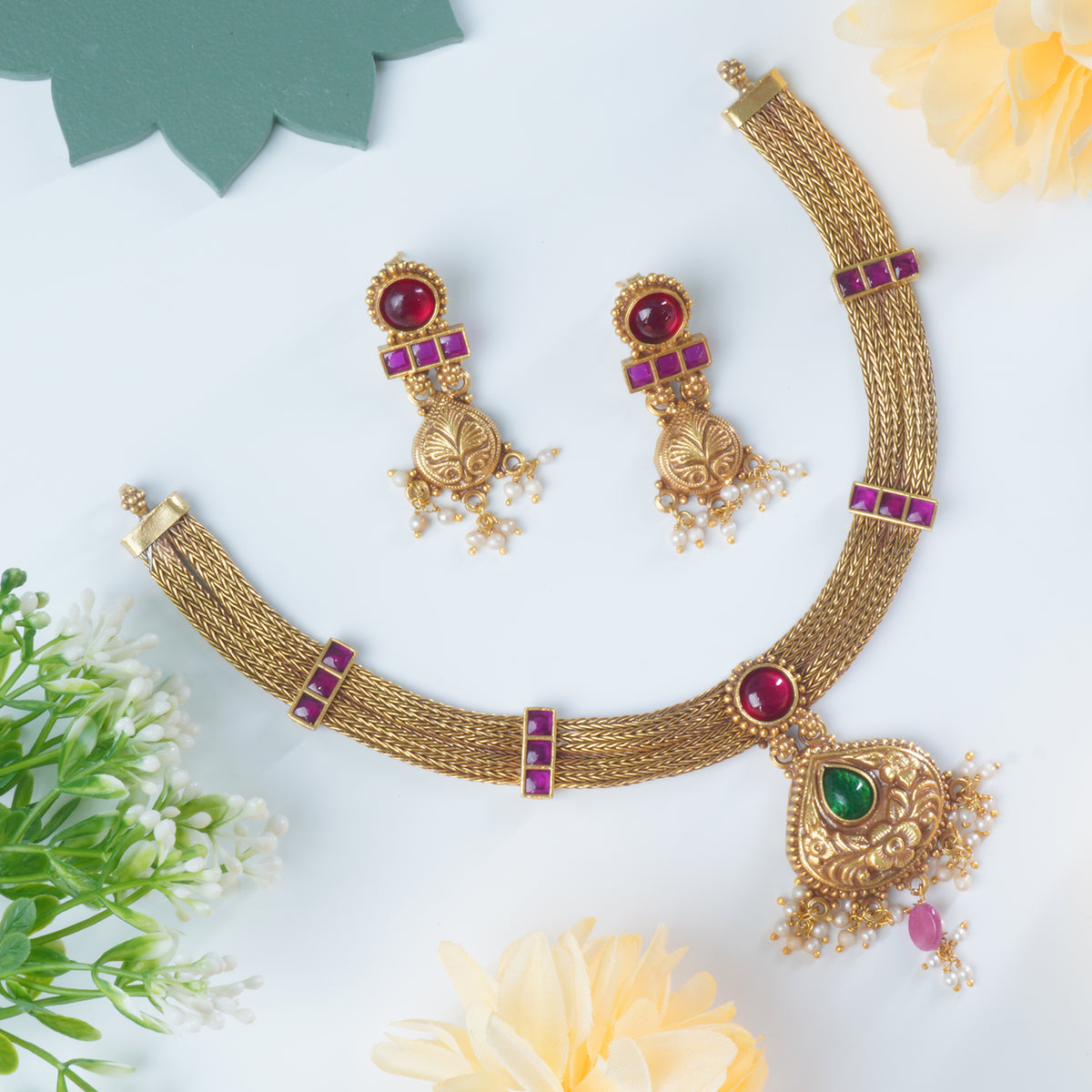 Gold Plated Kemp Studded Silver Chattai Necklace With Matching Earrings