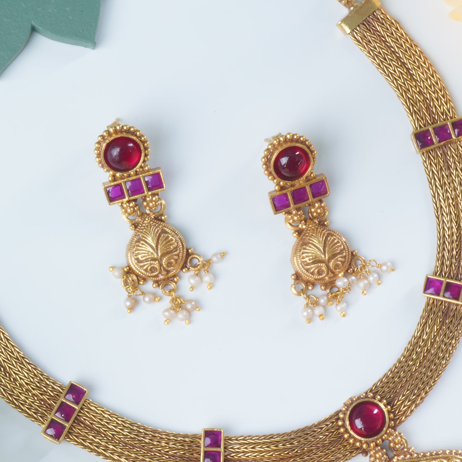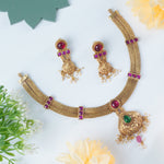Purely handmade silver necklace dipped in gold and matt antique finished , studded with kemp stones and freshwater pearls for a regal look. The freshwater pearls adds a touch of elegance to the necklace while the matching earrings complete it.
