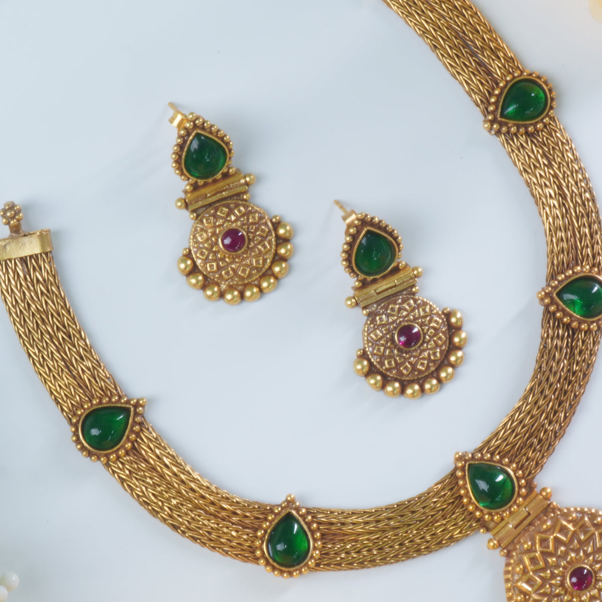 An intricate silver necklace design made with handmade silver chattai and decorated with green kemp stones. The Earrings are perfect match and gives it a complete look.