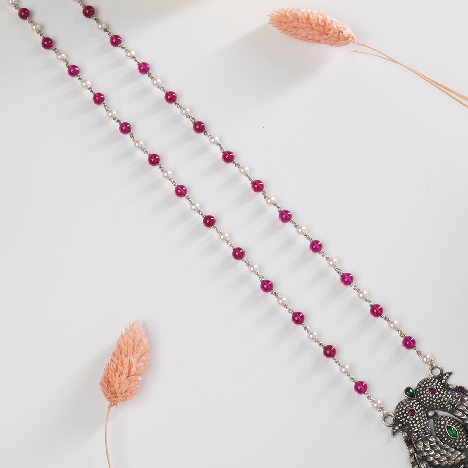 Long silver necklace made with redkemp glass beads and pearls. Each bead/ pearl is hand woven by karagirs of gold workers. the pendant adorns beautiful pearl and crystal ghungroos and red kemp stones.