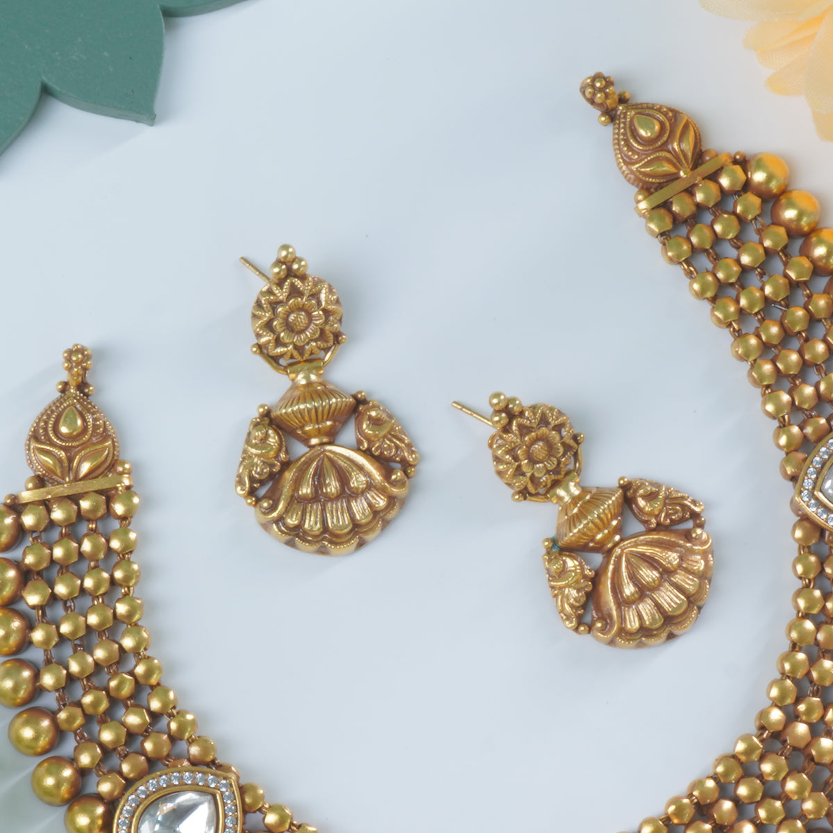 Purely handmade silver necklace dipped in gold and matt antique finished for a regal look. the 3 Stone studded pieces add a touch of regalness to the necklace. The matching earrings along with it are a perfect combo.