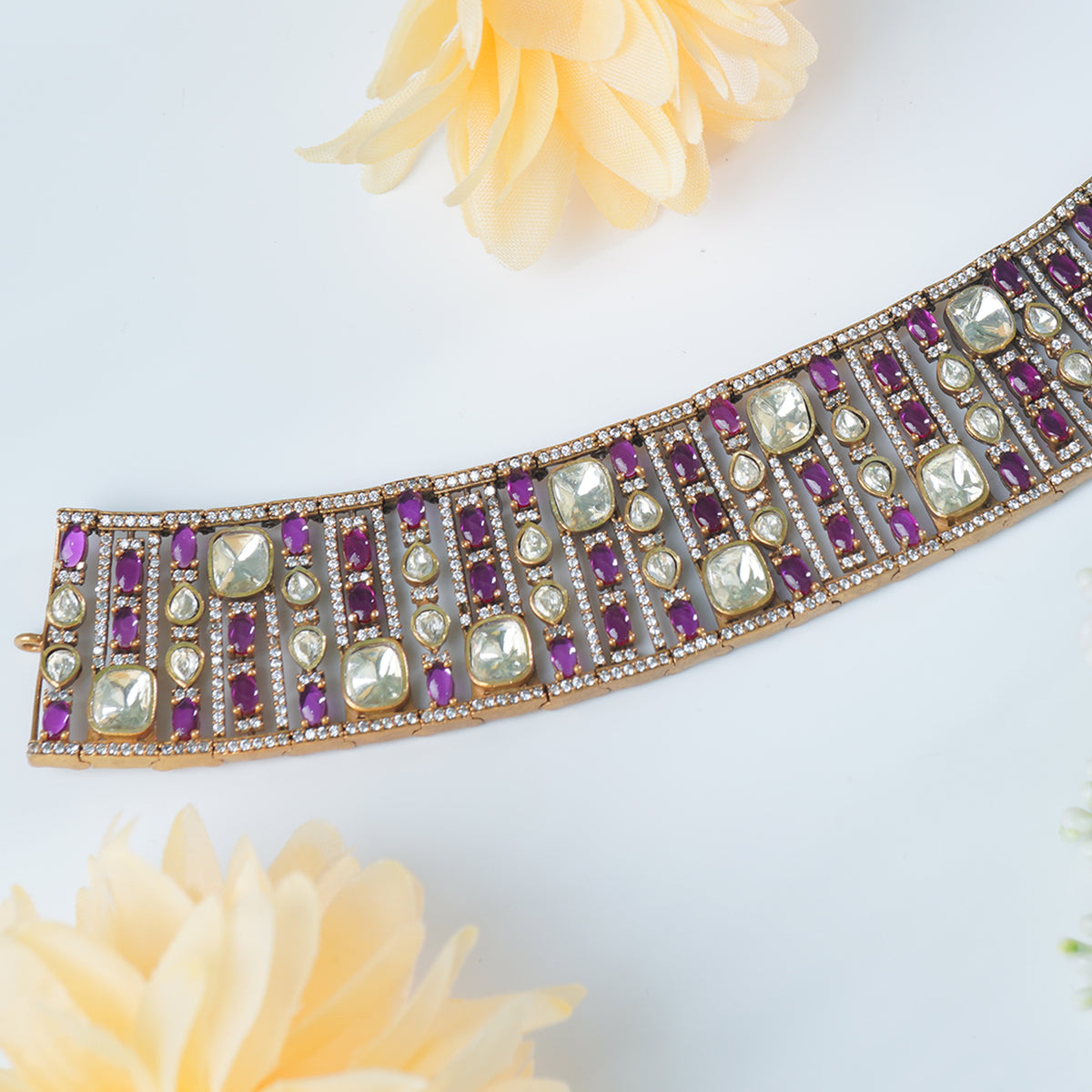 An intricately crafted silver necklace design with red kemp & Moissanite's. Each stone is hand set for a regal look. Dipped in gold this regal necklace oozes elegance and is a sure head turner.