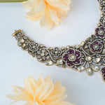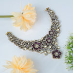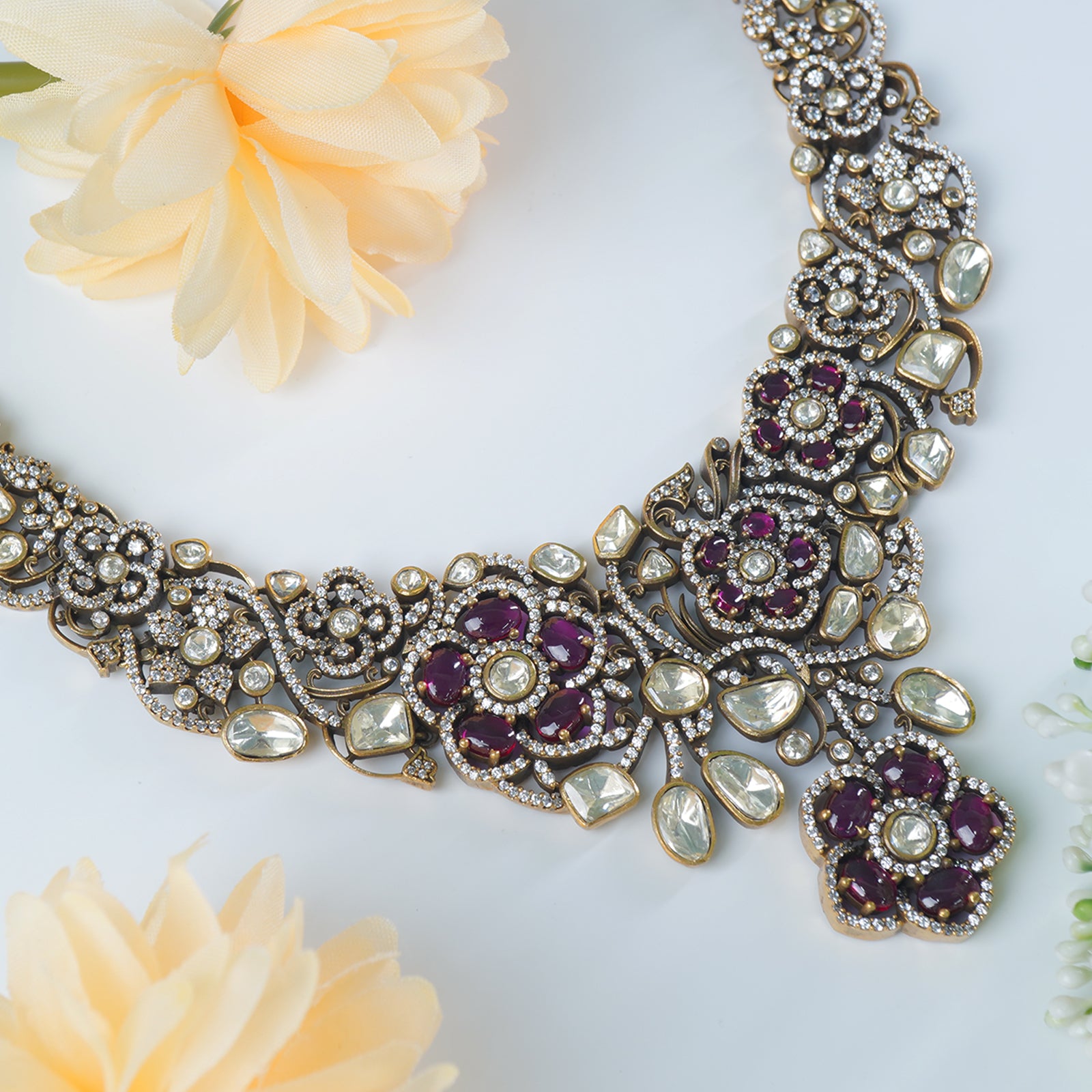 An intricately crafted silver necklace design with red kemp & Moissanite's. Each stone is hand set for a regal look. Dipped in gold this regal necklace oozes elegance and is a sure head turner.