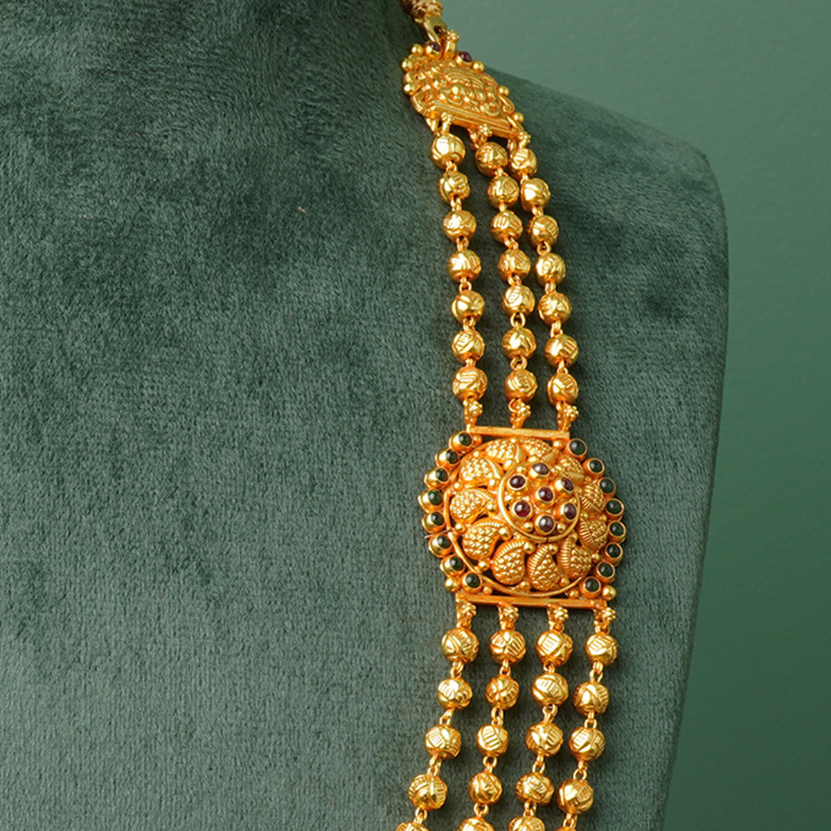 A: This 4 layer mala pairs beautifully with Kanchivaram sarees, Paithani sarees, Navaree saree, silk sarees, and bridal lehengas.