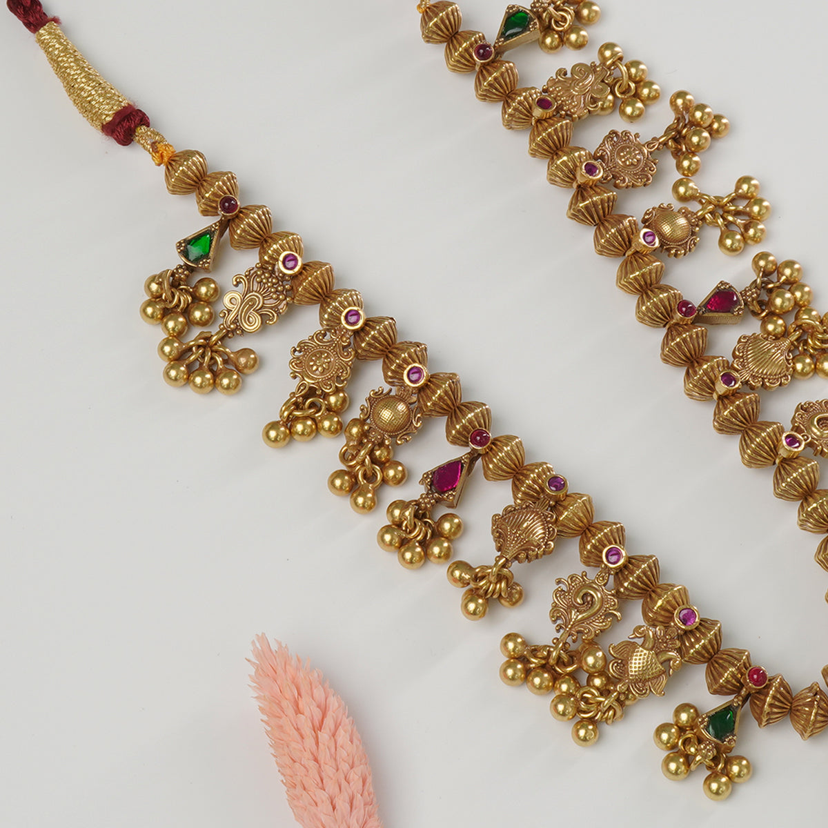 A: This pure 925 silver antique gold plated Kolhapuri Saaj pairs beautifully with a Navaree saree or Paithani saree for weddings and traditional functions. For a complete look, match it with temple-style bangles and traditional jhumkas. Our Range of kundan Jhumkas are also a perfect match for it.