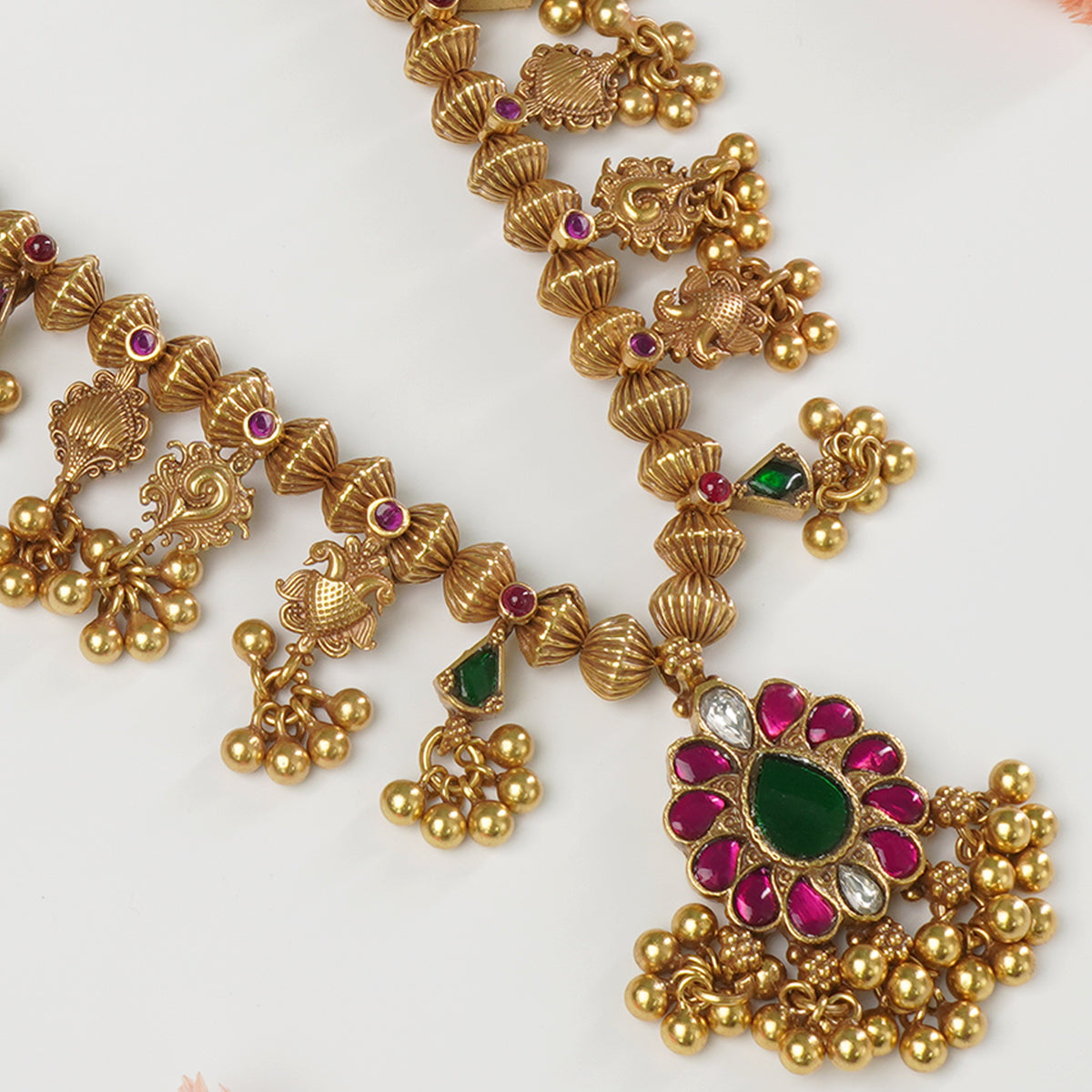 • Single-layer Kolhapuri Saaj design: fewer leaf “panadi” pendants and more beads, giving a simple yet regal Maharashtrian look.