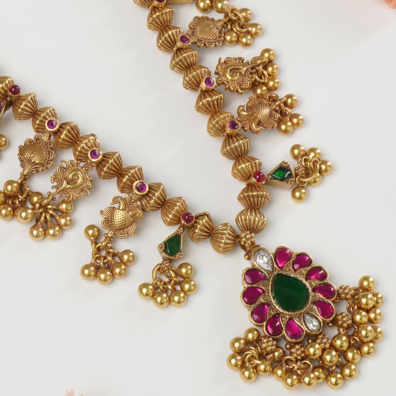 A: Javmani beads are traditional hand-strung seed beads (also called ghungroo or ghagri beads) used in Kolhapuri Saaj designs. They add an authentic Maharashtrian touch to the necklace.
