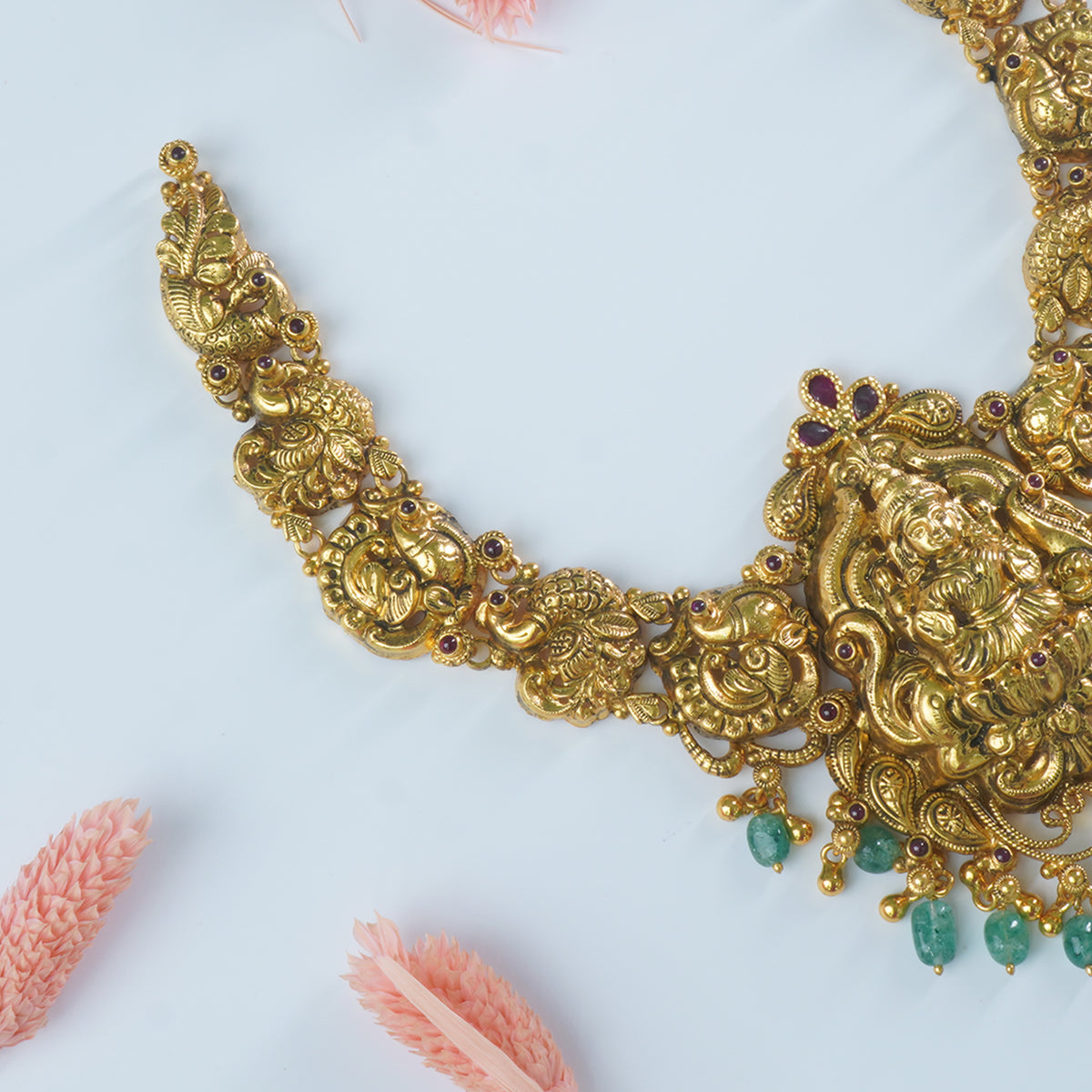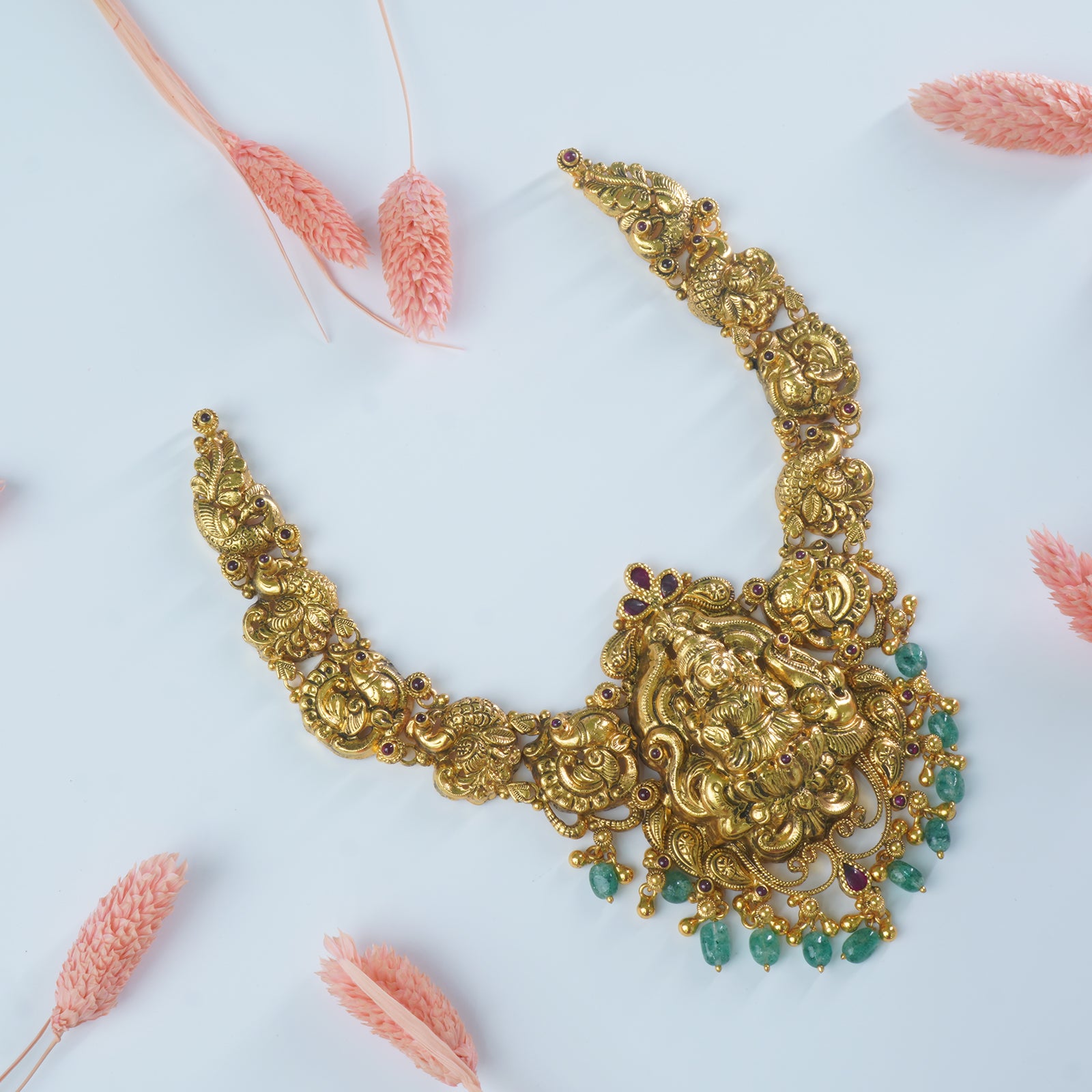 Antique gold necklace A royal silver nakashi necklace with and hand nakash laxmi pendant. The laxmi pendant is studded with stones ghugnroos . A fine piece of art a perfect match for your wedding attire!!